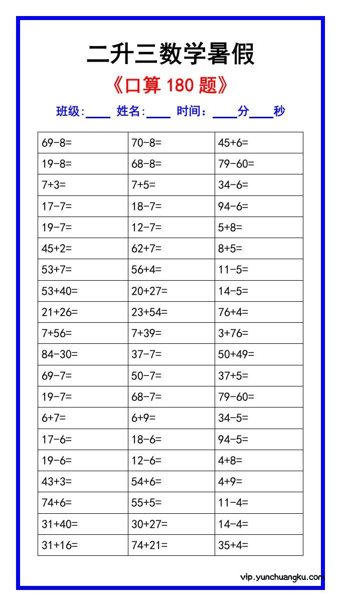 二升三数学暑假《口算练习180题》汇总-三上数学小岚4个月前更新关注私信0106273二升三数学暑假《口算练习180题》汇总-三上数学此内容为付费阅读,请付费后查看云创币 6年费会员免费终身会员免费立即购买您当前未登录!建议登陆后购买,可保存购买订单付费阅读已售 51 ——预览已结束,还剩2页未读——开通会员后可免费下载高清完整文档 课程下载: 此处内容已隐藏,请付费后查看 声明 1 本站名称: 云创项目库 2 本站网址:vip.yunchuangku.com 3 本站内容均转载于互联网,仅供大家学习与参考,如有侵权,请联系站长进行删除处理。 4 本站一切资源不代表本站立场,并不代表本站赞同其观点和对其真实性负责。 5 本站一律禁止以任何方式发布或转载任何违法的相关信息,访客发现请向站长举报。 6 本站附件资源、教程等内容如因时效原因失效或不可用,请评论区留言或联系站长及时更新。 © 版权声明本站内容均转载于互联网,并不代表云创项目库立场。如若本站内容侵犯了原著者的合法权益,可联系我们进行处理!THE END三年级数学 喜欢就支持一下吧点赞73 分享QQ空间微博QQ好友海报分享复制链接收藏