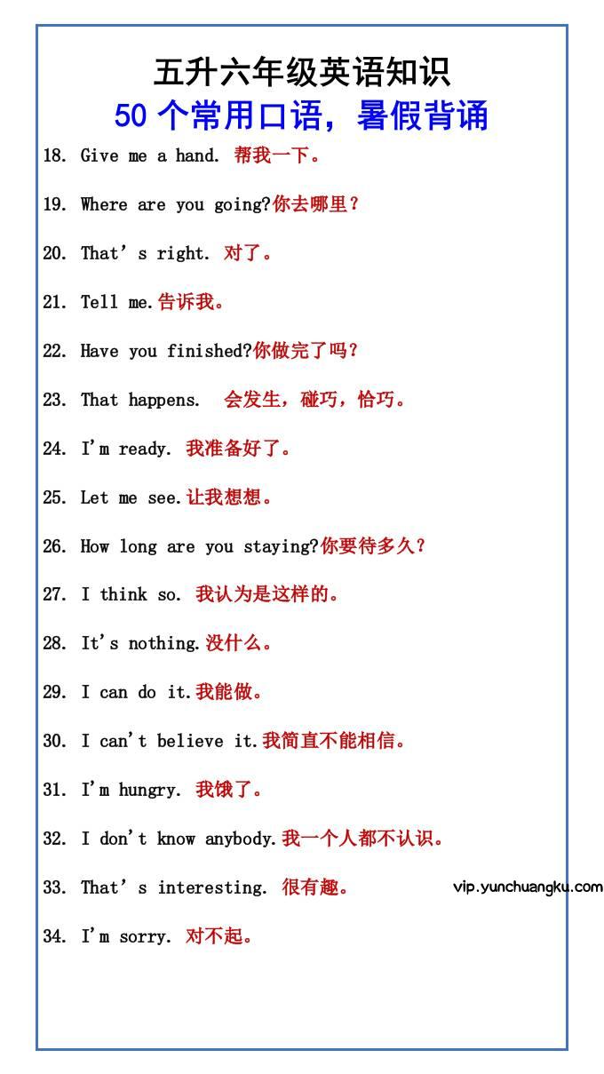 五升六年级英语知识50个常用口语,暑假背诵-六上英语小岚4个月前更新关注私信098077五升六年级英语知识50个常用口语,暑假背诵-六上英语此内容为付费阅读,请付费后查看云创币 6年费会员免费终身会员免费立即购买您当前未登录!建议登陆后购买,可保存购买订单付费阅读已售 57 ——预览已结束,还剩1页未读——开通会员后可免费下载高清完整文档 课程下载: 此处内容已隐藏,请付费后查看 声明 1 本站名称: 云创项目库 2 本站网址:vip.yunchuangku.com 3 本站内容均转载于互联网,仅供大家学习与参考,如有侵权,请联系站长进行删除处理。 4 本站一切资源不代表本站立场,并不代表本站赞同其观点和对其真实性负责。 5 本站一律禁止以任何方式发布或转载任何违法的相关信息,访客发现请向站长举报。 6 本站附件资源、教程等内容如因时效原因失效或不可用,请评论区留言或联系站长及时更新。 © 版权声明本站内容均转载于互联网,并不代表云创项目库立场。如若本站内容侵犯了原著者的合法权益,可联系我们进行处理!THE END六年级英语 喜欢就支持一下吧点赞77 分享QQ空间微博QQ好友海报分享复制链接收藏