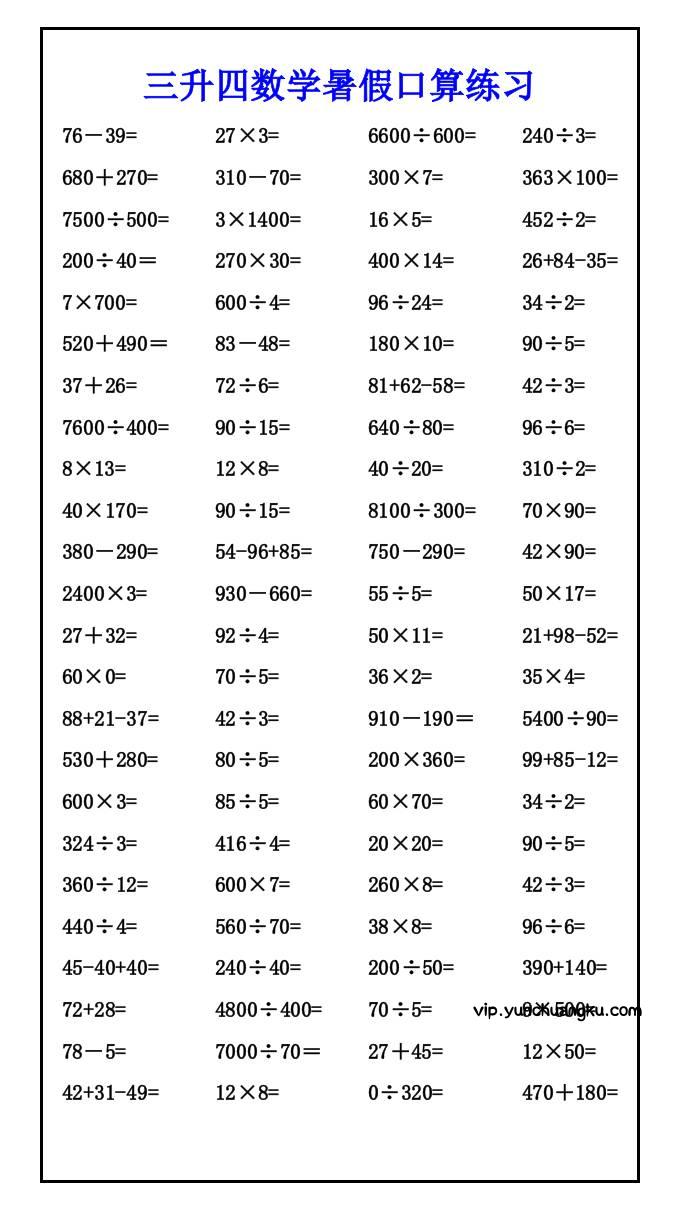 三升四数学暑假口算练习-四上数学小岚4个月前更新关注私信094057三升四数学暑假口算练习-四上数学此内容为付费阅读,请付费后查看云创币 6年费会员免费终身会员免费立即购买您当前未登录!建议登陆后购买,可保存购买订单付费阅读已售 57 ——预览已结束,还剩2页未读——开通会员后可免费下载高清完整文档 课程下载: 此处内容已隐藏,请付费后查看 声明 1 本站名称: 云创项目库 2 本站网址:vip.yunchuangku.com 3 本站内容均转载于互联网,仅供大家学习与参考,如有侵权,请联系站长进行删除处理。 4 本站一切资源不代表本站立场,并不代表本站赞同其观点和对其真实性负责。 5 本站一律禁止以任何方式发布或转载任何违法的相关信息,访客发现请向站长举报。 6 本站附件资源、教程等内容如因时效原因失效或不可用,请评论区留言或联系站长及时更新。 © 版权声明本站内容均转载于互联网,并不代表云创项目库立场。如若本站内容侵犯了原著者的合法权益,可联系我们进行处理!THE END四年级数学 喜欢就支持一下吧点赞57 分享QQ空间微博QQ好友海报分享复制链接收藏