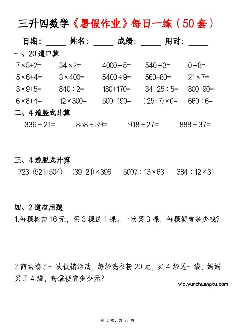 三升四数学暑假作业每日一练(50套)-四上数学小岚4个月前更新关注私信080761三升四数学暑假作业每日一练(50套)-四上数学此内容为付费阅读,请付费后查看云创币 6年费会员免费终身会员免费立即购买您当前未登录!建议登陆后购买,可保存购买订单付费阅读已售 47 ——预览已结束,还剩48页未读——开通会员后可免费下载高清完整文档 课程下载: 此处内容已隐藏,请付费后查看 声明 1 本站名称: 云创项目库 2 本站网址:vip.yunchuangku.com 3 本站内容均转载于互联网,仅供大家学习与参考,如有侵权,请联系站长进行删除处理。 4 本站一切资源不代表本站立场,并不代表本站赞同其观点和对其真实性负责。 5 本站一律禁止以任何方式发布或转载任何违法的相关信息,访客发现请向站长举报。 6 本站附件资源、教程等内容如因时效原因失效或不可用,请评论区留言或联系站长及时更新。 © 版权声明本站内容均转载于互联网,并不代表云创项目库立场。如若本站内容侵犯了原著者的合法权益,可联系我们进行处理!THE END四年级数学 喜欢就支持一下吧点赞61 分享QQ空间微博QQ好友海报分享复制链接收藏