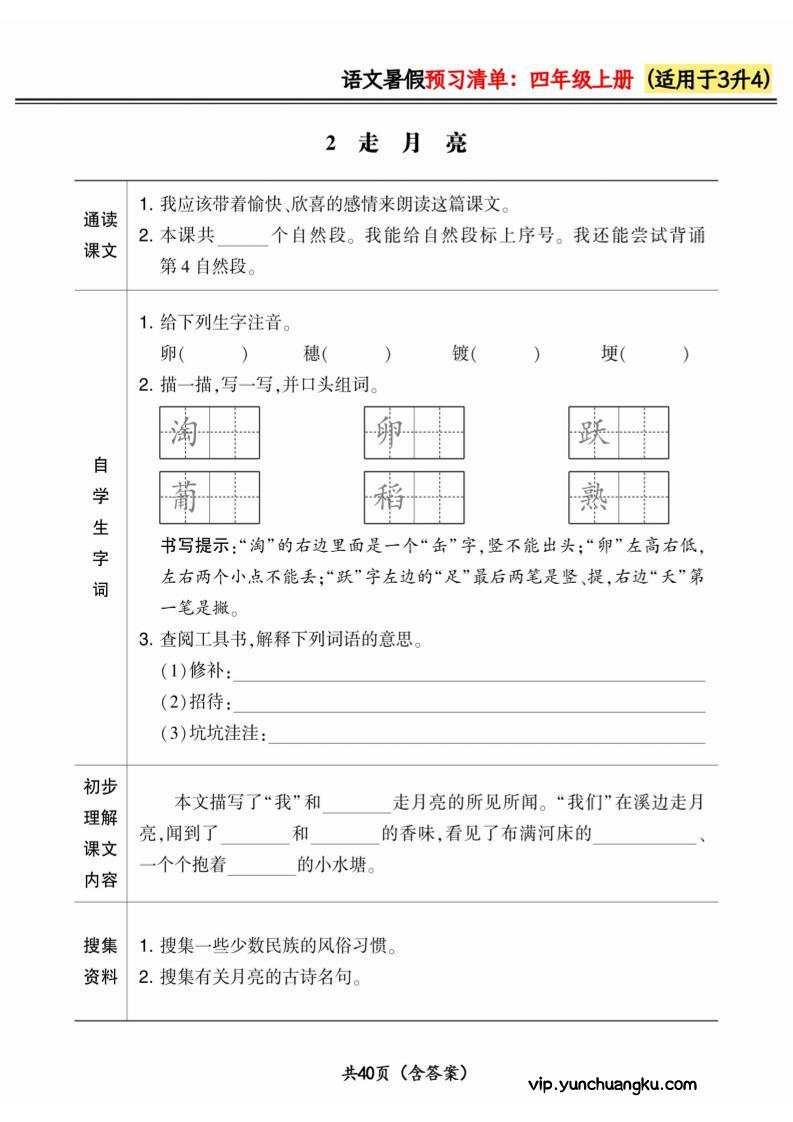 三升四小学语文《暑假预习清单》最新版-四上语文小岚4个月前更新关注私信080866三升四小学语文《暑假预习清单》最新版-四上语文此内容为付费阅读,请付费后查看云创币 6年费会员免费终身会员免费立即购买您当前未登录!建议登陆后购买,可保存购买订单付费阅读已售 47 ——预览已结束,还剩38页未读——开通会员后可免费下载高清完整文档 课程下载: 此处内容已隐藏,请付费后查看 声明 1 本站名称: 云创项目库 2 本站网址:vip.yunchuangku.com 3 本站内容均转载于互联网,仅供大家学习与参考,如有侵权,请联系站长进行删除处理。 4 本站一切资源不代表本站立场,并不代表本站赞同其观点和对其真实性负责。 5 本站一律禁止以任何方式发布或转载任何违法的相关信息,访客发现请向站长举报。 6 本站附件资源、教程等内容如因时效原因失效或不可用,请评论区留言或联系站长及时更新。 © 版权声明本站内容均转载于互联网,并不代表云创项目库立场。如若本站内容侵犯了原著者的合法权益,可联系我们进行处理!THE END四年级语文 喜欢就支持一下吧点赞66 分享QQ空间微博QQ好友海报分享复制链接收藏