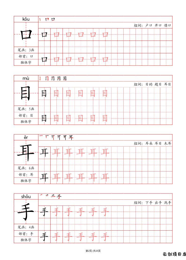 一上语文写字表字帖(笔画+部首+笔顺+组词)小岚4个月前更新关注私信0114080一上语文写字表字帖(笔画+部首+笔顺+组词)此内容为付费阅读,请付费后查看云创币 6年费会员免费终身会员免费立即购买您当前未登录!建议登陆后购买,可保存购买订单付费阅读已售 54 ——预览已结束,还剩23页未读——开通会员后可免费下载高清完整文档 课程下载: 此处内容已隐藏,请付费后查看 声明 1 本站名称: 云创项目库 2 本站网址:vip.yunchuangku.com 3 本站内容均转载于互联网,仅供大家学习与参考,如有侵权,请联系站长进行删除处理。 4 本站一切资源不代表本站立场,并不代表本站赞同其观点和对其真实性负责。 5 本站一律禁止以任何方式发布或转载任何违法的相关信息,访客发现请向站长举报。 6 本站附件资源、教程等内容如因时效原因失效或不可用,请评论区留言或联系站长及时更新。 © 版权声明本站内容均转载于互联网,并不代表云创项目库立场。如若本站内容侵犯了原著者的合法权益,可联系我们进行处理!THE END一年级语文 喜欢就支持一下吧点赞80 分享QQ空间微博QQ好友海报分享复制链接收藏