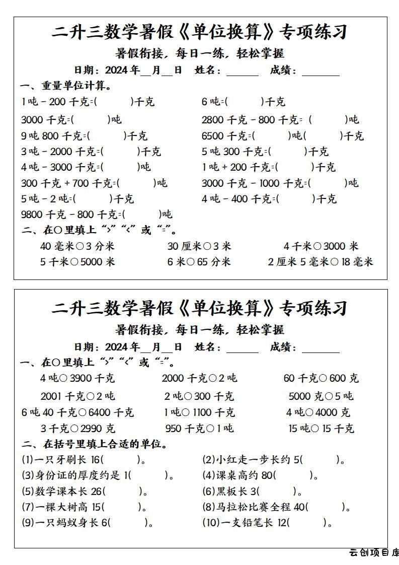 二升三数学暑假《单位换算》专项练习-三上数学小岚4个月前更新关注私信0100268二升三数学暑假《单位换算》专项练习-三上数学此内容为付费阅读,请付费后查看云创币 6年费会员免费终身会员免费立即购买您当前未登录!建议登陆后购买,可保存购买订单付费阅读已售 43 ——预览已结束,还剩3页未读——开通会员后可免费下载高清完整文档 课程下载: 此处内容已隐藏,请付费后查看 声明 1 本站名称: 云创项目库 2 本站网址:vip.yunchuangku.com 3 本站内容均转载于互联网,仅供大家学习与参考,如有侵权,请联系站长进行删除处理。 4 本站一切资源不代表本站立场,并不代表本站赞同其观点和对其真实性负责。 5 本站一律禁止以任何方式发布或转载任何违法的相关信息,访客发现请向站长举报。 6 本站附件资源、教程等内容如因时效原因失效或不可用,请评论区留言或联系站长及时更新。 © 版权声明本站内容均转载于互联网,并不代表云创项目库立场。如若本站内容侵犯了原著者的合法权益,可联系我们进行处理!THE END三年级数学 喜欢就支持一下吧点赞68 分享QQ空间微博QQ好友海报分享复制链接收藏