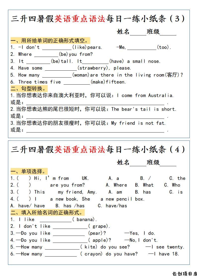 三升四暑假英语重点语法每日一练小纸条-四上英语小岚4个月前更新关注私信0106567三升四暑假英语重点语法每日一练小纸条-四上英语此内容为付费阅读,请付费后查看云创币 6年费会员免费终身会员免费立即购买您当前未登录!建议登陆后购买,可保存购买订单付费阅读已售 49 ——预览已结束,还剩3页未读——开通会员后可免费下载高清完整文档 课程下载: 此处内容已隐藏,请付费后查看 声明 1 本站名称: 云创项目库 2 本站网址:vip.yunchuangku.com 3 本站内容均转载于互联网,仅供大家学习与参考,如有侵权,请联系站长进行删除处理。 4 本站一切资源不代表本站立场,并不代表本站赞同其观点和对其真实性负责。 5 本站一律禁止以任何方式发布或转载任何违法的相关信息,访客发现请向站长举报。 6 本站附件资源、教程等内容如因时效原因失效或不可用,请评论区留言或联系站长及时更新。 © 版权声明本站内容均转载于互联网,并不代表云创项目库立场。如若本站内容侵犯了原著者的合法权益,可联系我们进行处理!THE END四年级英语 喜欢就支持一下吧点赞67 分享QQ空间微博QQ好友海报分享复制链接收藏