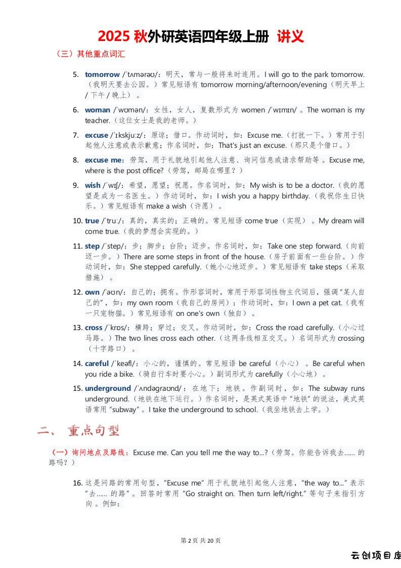 2025秋外研英语四年级上册讲义Unit06小岚4个月前更新关注私信0800772025秋外研英语四年级上册讲义Unit06此内容为付费阅读,请付费后查看云创币 6年费会员免费终身会员免费立即购买您当前未登录!建议登陆后购买,可保存购买订单付费阅读已售 40 ——预览已结束,还剩18页未读——开通会员后可免费下载高清完整文档 课程下载: 此处内容已隐藏,请付费后查看 声明 1 本站名称: 云创项目库 2 本站网址:vip.yunchuangku.com 3 本站内容均转载于互联网,仅供大家学习与参考,如有侵权,请联系站长进行删除处理。 4 本站一切资源不代表本站立场,并不代表本站赞同其观点和对其真实性负责。 5 本站一律禁止以任何方式发布或转载任何违法的相关信息,访客发现请向站长举报。 6 本站附件资源、教程等内容如因时效原因失效或不可用,请评论区留言或联系站长及时更新。 © 版权声明本站内容均转载于互联网,并不代表云创项目库立场。如若本站内容侵犯了原著者的合法权益,可联系我们进行处理!THE END四年级英语 喜欢就支持一下吧点赞77 分享QQ空间微博QQ好友海报分享复制链接收藏