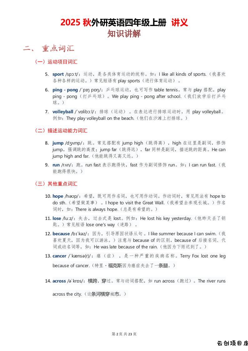 2025秋外研英语四年级上册讲义Unit01小岚4个月前更新关注私信01005662025秋外研英语四年级上册讲义Unit01此内容为付费阅读,请付费后查看云创币 6年费会员免费终身会员免费立即购买您当前未登录!建议登陆后购买,可保存购买订单付费阅读已售 42 ——预览已结束,还剩21页未读——开通会员后可免费下载高清完整文档 课程下载: 此处内容已隐藏,请付费后查看 声明 1 本站名称: 云创项目库 2 本站网址:vip.yunchuangku.com 3 本站内容均转载于互联网,仅供大家学习与参考,如有侵权,请联系站长进行删除处理。 4 本站一切资源不代表本站立场,并不代表本站赞同其观点和对其真实性负责。 5 本站一律禁止以任何方式发布或转载任何违法的相关信息,访客发现请向站长举报。 6 本站附件资源、教程等内容如因时效原因失效或不可用,请评论区留言或联系站长及时更新。 © 版权声明本站内容均转载于互联网,并不代表云创项目库立场。如若本站内容侵犯了原著者的合法权益,可联系我们进行处理!THE END四年级英语 喜欢就支持一下吧点赞66 分享QQ空间微博QQ好友海报分享复制链接收藏