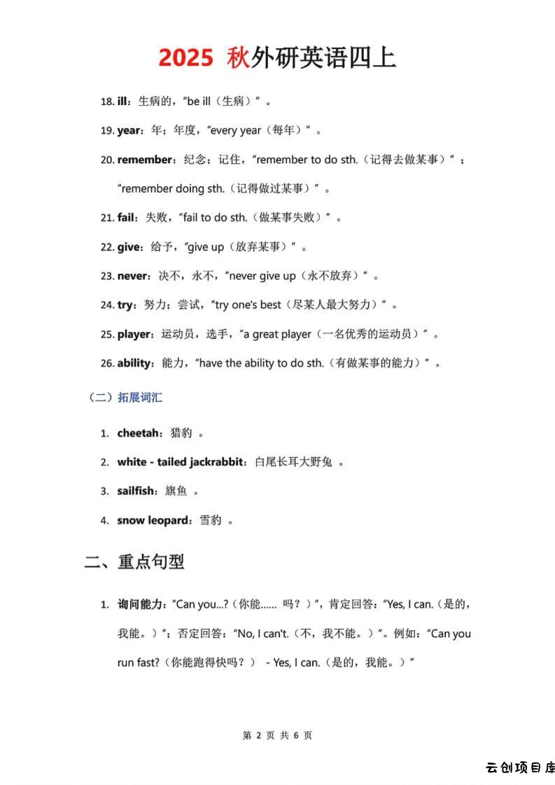 2025秋外研英语四上课堂笔记Unit_1小岚4个月前更新关注私信01078602025秋外研英语四上课堂笔记Unit_1此内容为付费阅读,请付费后查看云创币 6年费会员免费终身会员免费立即购买您当前未登录!建议登陆后购买,可保存购买订单付费阅读已售 41 ——预览已结束,还剩4页未读——开通会员后可免费下载高清完整文档 课程下载: 此处内容已隐藏,请付费后查看 声明 1 本站名称: 云创项目库 2 本站网址:vip.yunchuangku.com 3 本站内容均转载于互联网,仅供大家学习与参考,如有侵权,请联系站长进行删除处理。 4 本站一切资源不代表本站立场,并不代表本站赞同其观点和对其真实性负责。 5 本站一律禁止以任何方式发布或转载任何违法的相关信息,访客发现请向站长举报。 6 本站附件资源、教程等内容如因时效原因失效或不可用,请评论区留言或联系站长及时更新。 © 版权声明本站内容均转载于互联网,并不代表云创项目库立场。如若本站内容侵犯了原著者的合法权益,可联系我们进行处理!THE END四年级英语 喜欢就支持一下吧点赞60 分享QQ空间微博QQ好友海报分享复制链接收藏