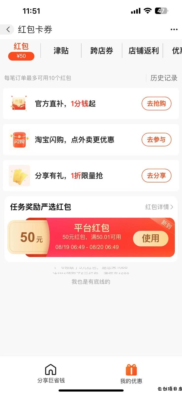 本期所分享的是一个典型的羊毛福利项目,通过一些简单的技巧操作获取50元无门槛的红包奖励,红包可以购买阿里的任何实物产品进行抵扣