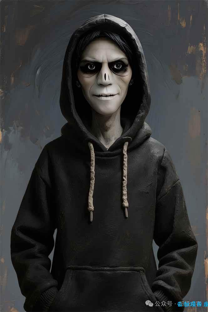 ***男子正对镜头,他的皮肤,是用厚涂技法(impasto)的油彩渲染出的病态惨灰白色,这个男子穿着一件黑色连帽衫)。 强烈的明暗对照效果(Chiaroscuro)将他孤独的身影置于画面的视觉中心。