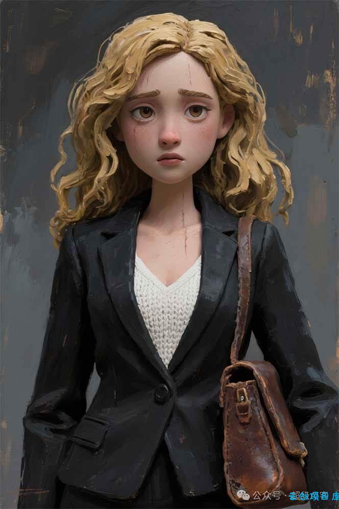 ***她有一张精致的、略显憔悴的脸庞,被她那长长的金色波浪卷发,每一缕发丝都像是用厚涂技法(impasto)精心塑造的,带有清晰的笔触痕迹。她那双杏仁状的大眼睛忧郁地低垂着,小巧而精心雕琢的嘴唇微微张开。她身着一套剪裁利落的黑色西装,西装外套的布料上能看到哑光的、有质感的笔触。西装内搭一件洁白的白色v领毛制吊带,其针织纹理通过精细的油彩凸起巧妙地表现出来。她的一只胳膊上挎着一个牛皮包,包的表面呈现出一种带有磨损感的皮革质地。