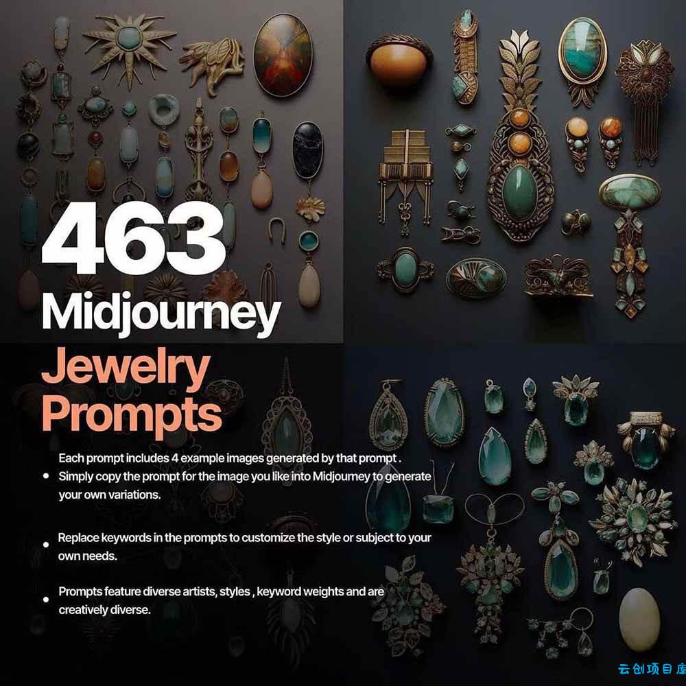 用463条专业的Midjourney提示,打造惊艳的珠宝设计,带来无限的创意可能性。