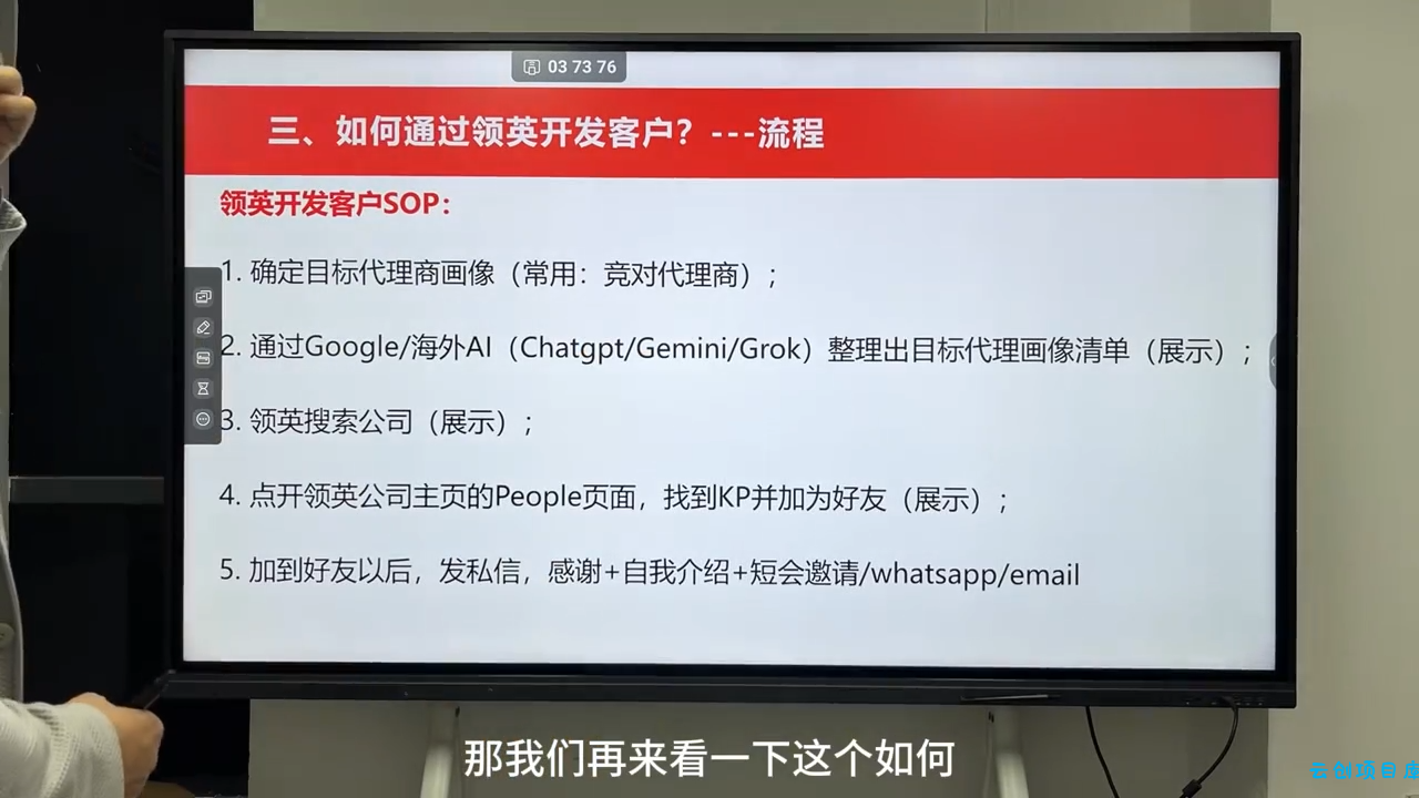 课程来自雨哥的海外B2B销售全链路实战营。课程先理清海外销售核心差异与企业出海阶段,教你面试通关、领英账号搭建与客户开发。再拆解标准化销售 SOP,覆盖公司调研、代理商招募签约、渠道维护、视频会议、商务谈判等实操环节。同时配套专业销售资料包,详解市场洞察、业务策略与战略规划,帮你搭建完整销售能力体系,快速掌握海外拓客、渠道管理与成单技巧。